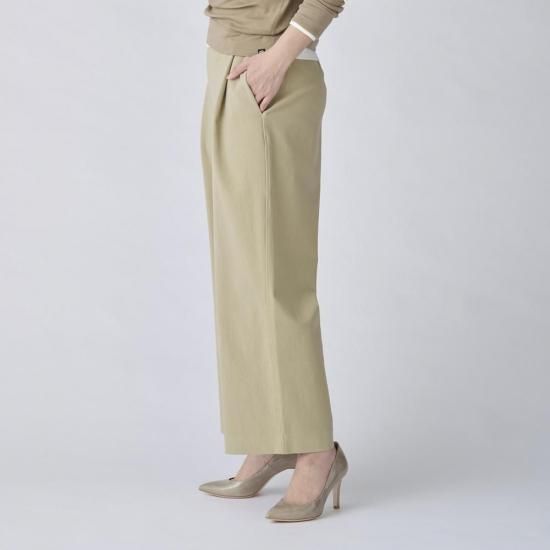 たっぷりとしたシルエットが特徴のワイドタックパンツ。腰回りのゆとりとフルレングス丈が、動きやすさとエレガントさを兼ね備えています。生地の落ち感をいかしたラインは、立ち姿も歩く姿も美しく見せてくれる一本です。